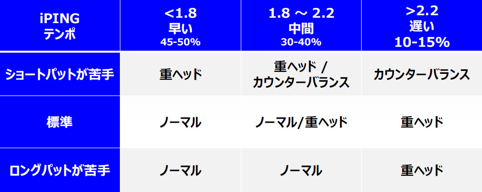 プレーヤーテストの結果をチェックしていたピンの開発チームは、パッティングのテンポとヘッド重量に相関性があることを発見しました。テンポの速いゴルファーは軽いパターの方がパッティングの再現性が高く、逆に遅いゴルファーは重いヘッドの方が再現性が高かったのです。ピンには『iPING』というパッティングのテンポを数値化するアプリがあるため、この結果を元により貴方に適したヘッドをチョイスすることができます(2015年春以降『iPING』に導入予定です。また、下の「エキストラビジュアル」に参考データを記載しています)。