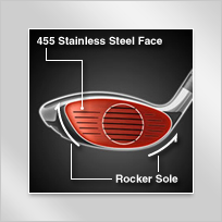 ヒールからトゥにかけて緩やかな曲線を描く『ロッカーソール』。これは角度のあるきついライでも、ソールのトゥやヒールがぶつからないよう考慮されたデザインです。またフェースには高強度の455ステンレススチールを採用。場所によってフェース面の厚さを変える『テクニカル・フェース』設計により、従来よりも大幅にスイートエリアを拡大することに成功しました。